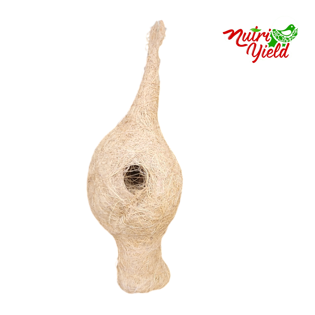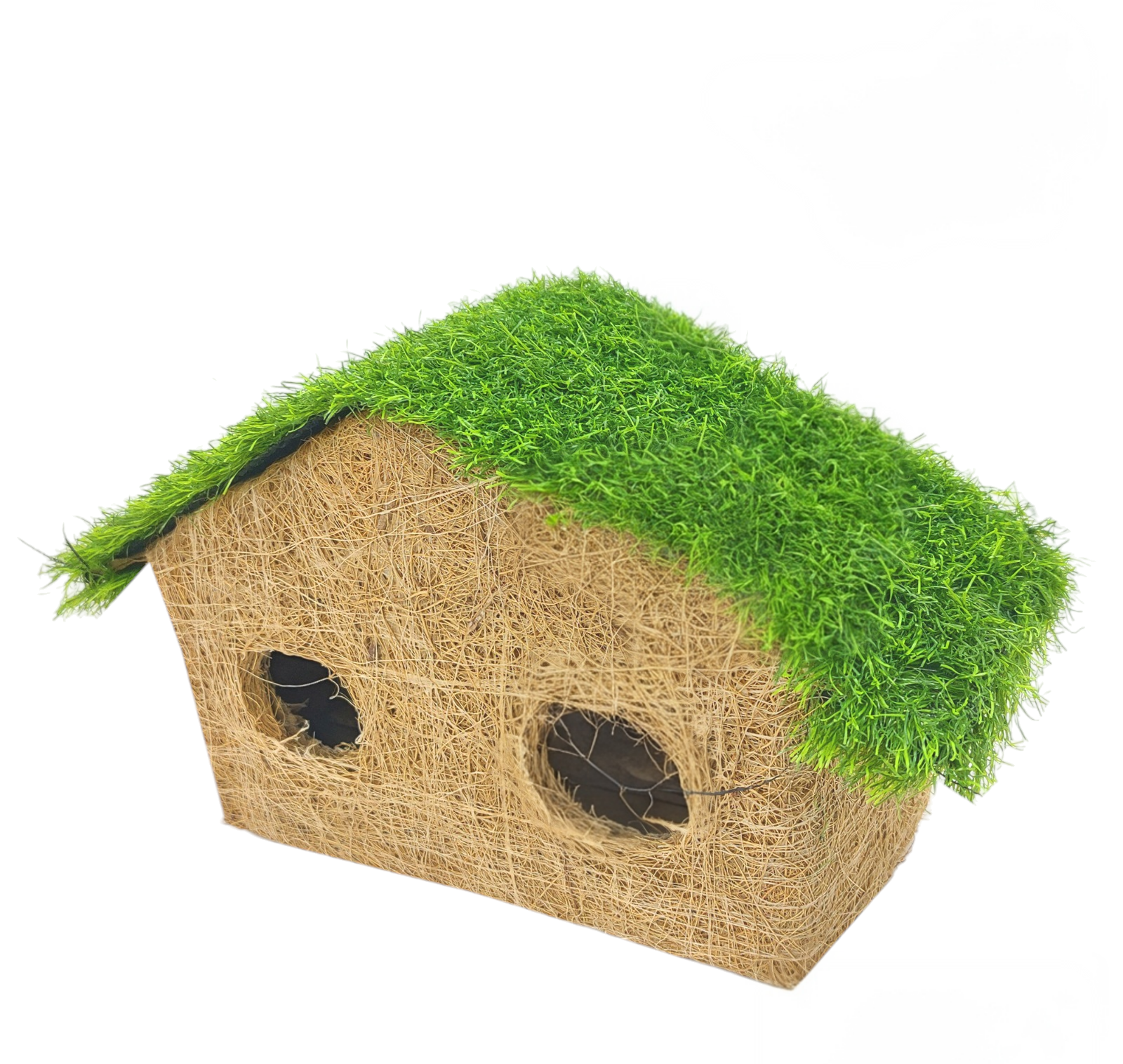 Natural coconut fiber birdhouse with artificial grass roof – ideal for small birds and eco-conscious garden decor.