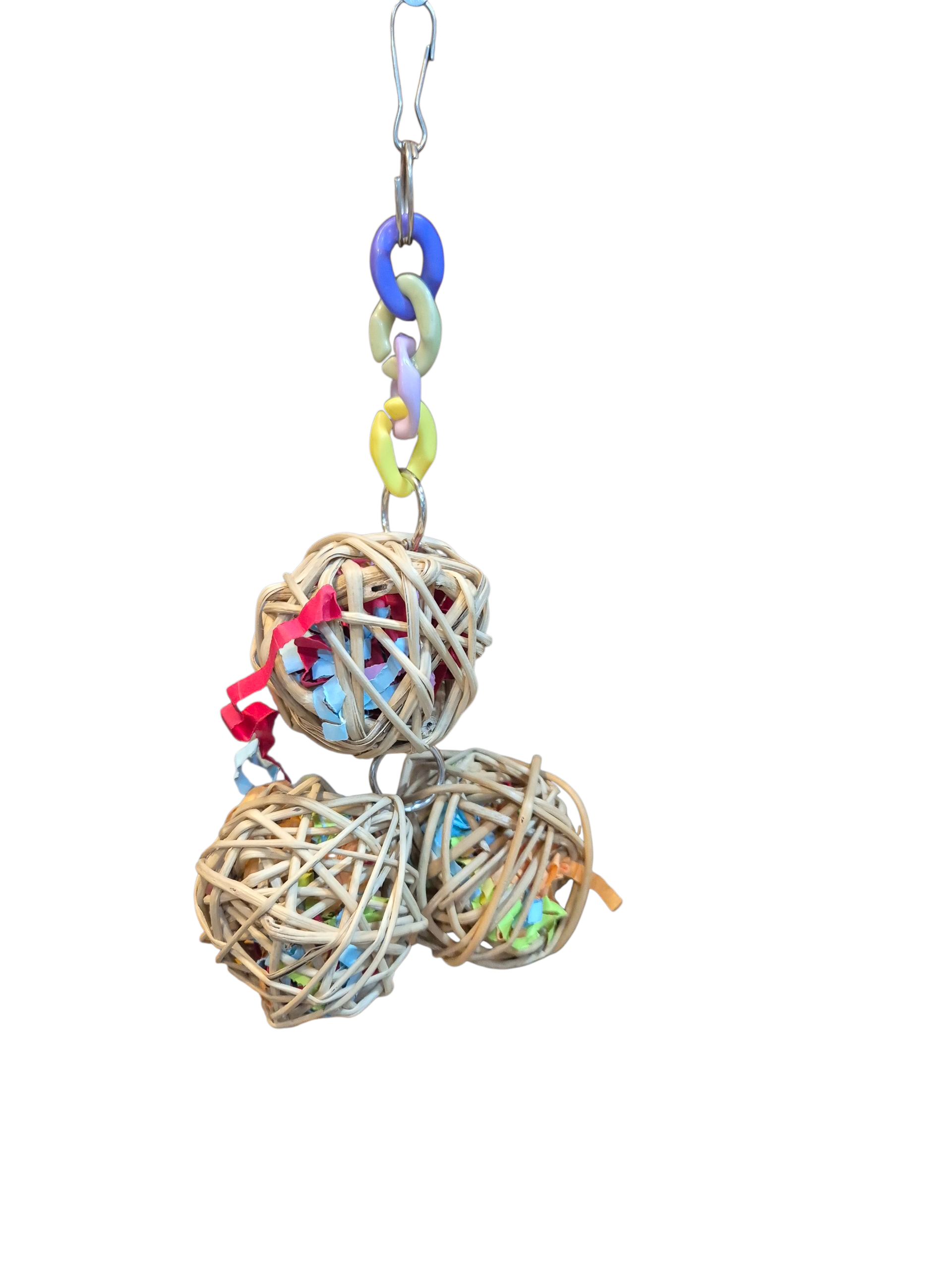 Three natural vine balls packed with shredded paper and hung on colorful plastic links.