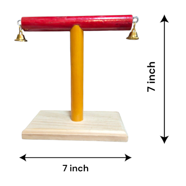 Compact wooden T-stand perch with bells – great for playtime or training.