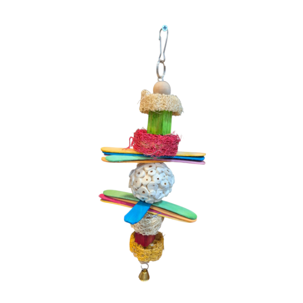 A playful mix of textures, loofah, sticks, and beads in a colorful vertical tower.