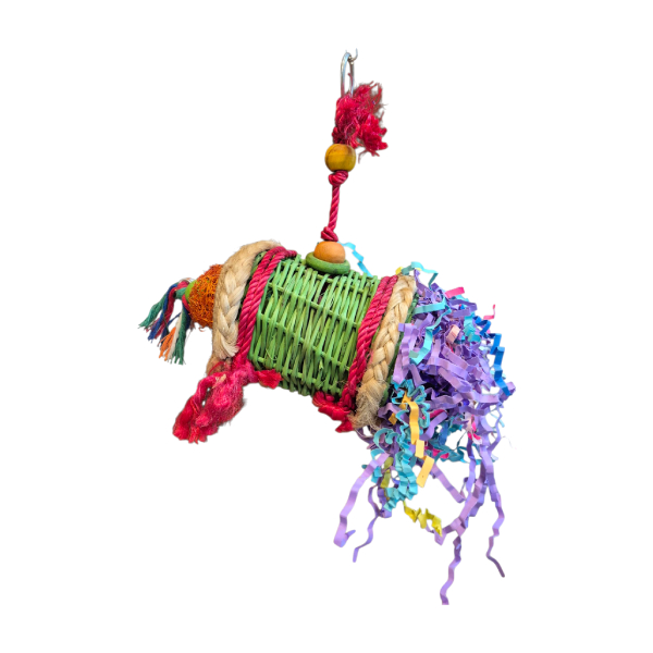 A woven tube stuffed with crinkle paper, topped with ropes and beads – perfect for shredding fun.